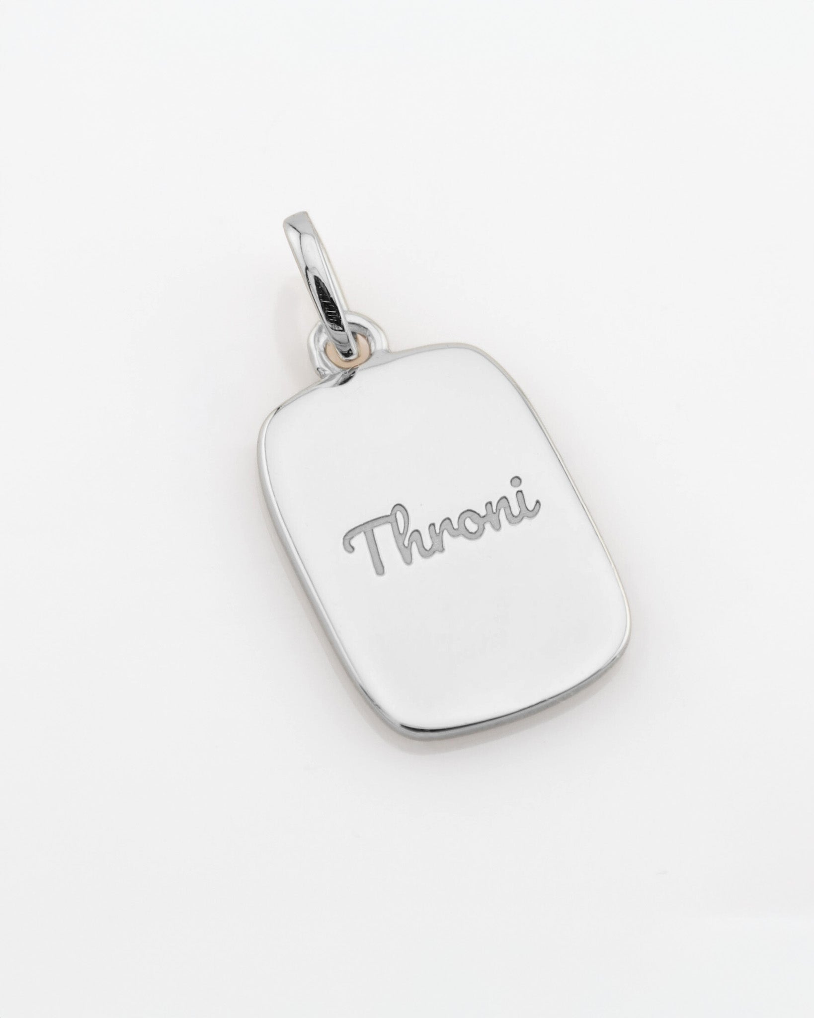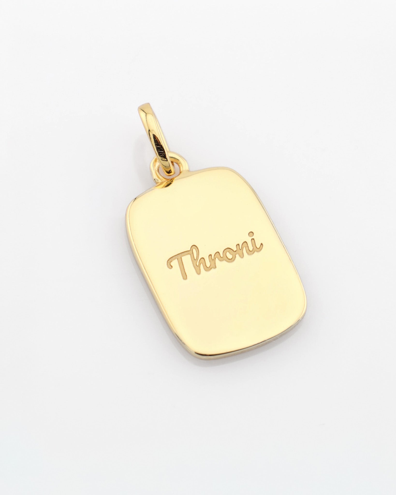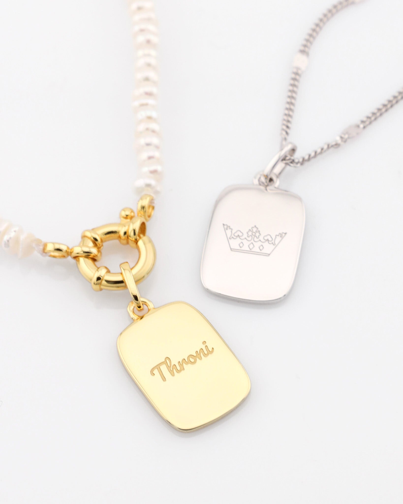 Der Throni Anhänger aus der Die Thronfolge x ruru. studios Kollektion ist ein Schmuckstück für all jene, die das Herz der Community ausmachen. Auf der Vorderseite steht „Throni“ – der liebevolle Name, mit dem Karin und Dara ihre Hörerschaft ansprechen. Ein Wort, das längst mehr ist als ein Spitzname: es ist ein Gefühl von Zuhause, Zugehörigkeit und gemeinsamem Lachen.